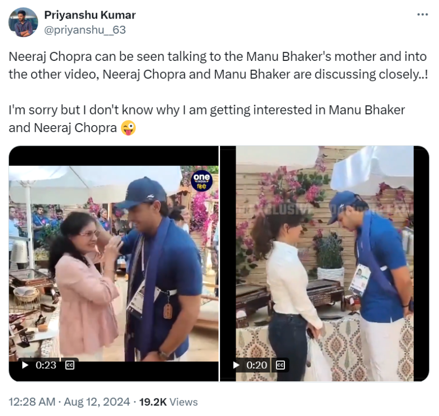 A video of Manu Bhaker's mother, Sumedha Bhaker, meeting javelin star Neeraj Chopra has gone viral, leading to a wave of online speculation. Many joked that Sumedha was assessing Neeraj as a potential match for her daughter. In response to the viral memes, Manu Bhaker’s father, Ram Kishan Bhaker, clarified that marriage is not on their minds as Manu is "still too young."